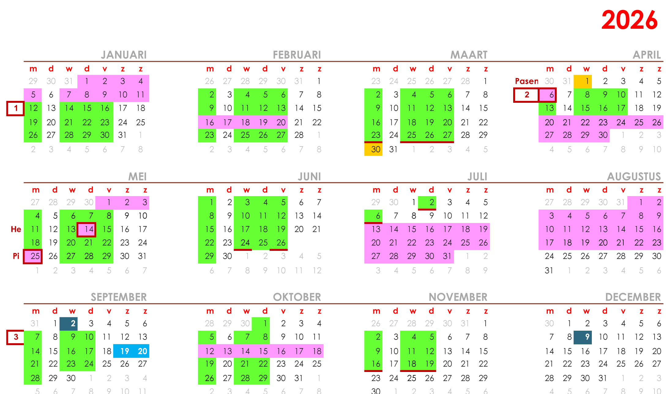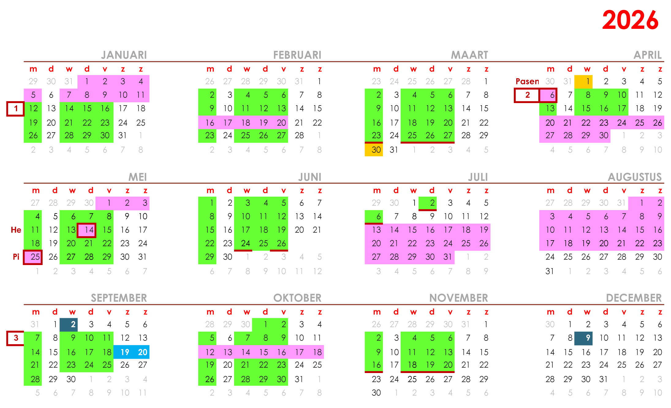 groen = cursusdagen, blauw = les kunstgeschiedenis, roze = nationale feestdagen/schoolvakanties, lichtblauw = expositie tijdens het weekend van Kunstroute Best in 't Tejaterke, geel = uitgevallen les(sen) die ingehaald zijn/gaan worden.